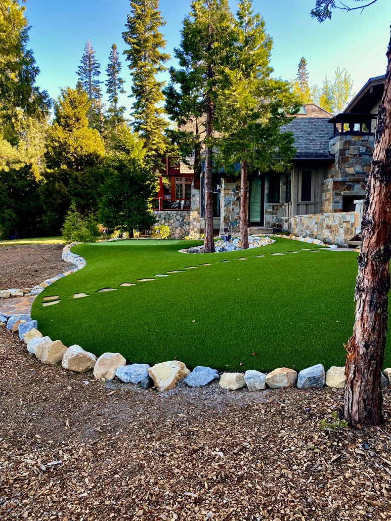 Natural Tech Artificial Grass & Landscaping recently installed 1,800 square feet of Synthetic Grass Warehouse’s Playground and Poly Putt 2-Tone in a home in Lake Tahoe, CA. Everlast Poly Putt 2-Tone — used for the putting green surface — features a dual coloring of field green and lime green, and it has a face weight of 50 ounces. With a 0.50-inch pile height, it is ideal for residential or professional putting green installations. Everlast Playground — used for the bulk of the landscape turf — has dual field green and olive green blade tones with brown thatch, and it has a pile height of 1.375 inches. With a 55-ounce face weight, it is ideal for landscapes with heavy foot traffic, including playgrounds and schoolyards. Both turf products are manufactured with UV inhibitors for long-lasting color that won’t fade with extended exposure to sunlight. All artificial grass products from Synthetic Grass Warehouse are non-toxic, lead-free, and will drain at a rate of 30 inches per hour per square yard.