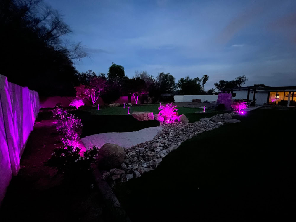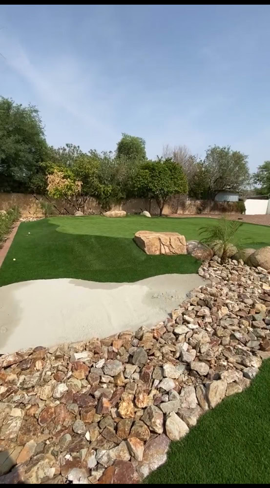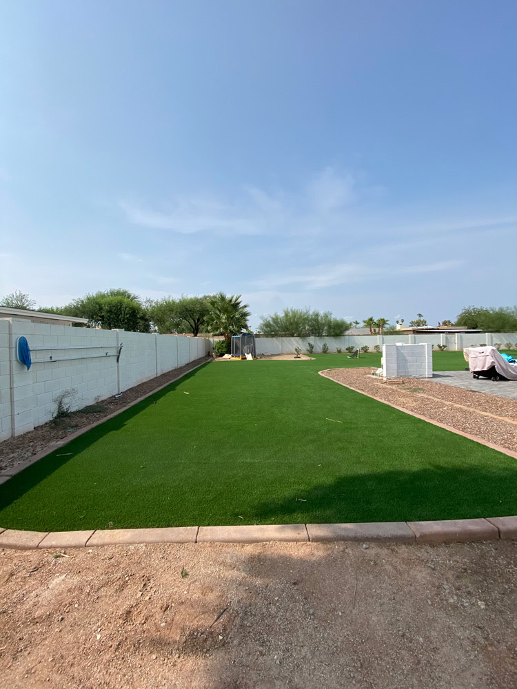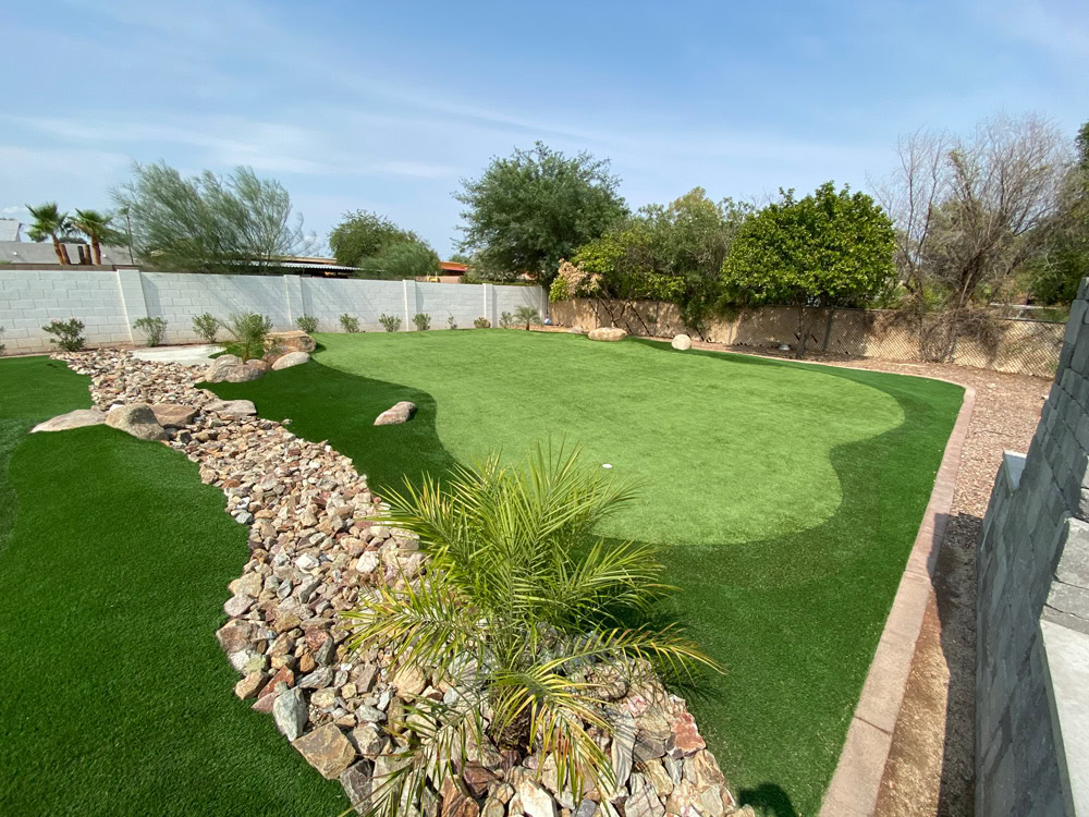 Arizona Turf King’s client was seeking a drought-tolerant landscaping solution that would allow them to enjoy the convenience of a putting green in their backyard while still leaving room for their son and two pets to run and play. Arizona Turf King installed more than 8,000 feet of turf that included lush landscape grass for the little ones to enjoy as well as a durable custom putting green. The putting green posed a unique challenge to the installer, as it covered four different elevations. As a result, the putting green fringe had to be customized and carefully installed to perfectly suit the various contours and elevations of the backyard. Arizona Turf King went above and beyond to please their client, and now the homeowners enjoy a clean, durable, and beautiful backyard that’s fun for the whole family.